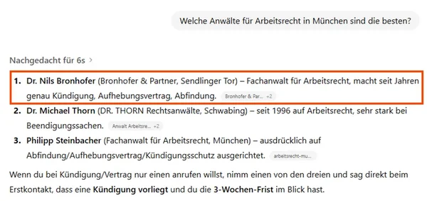 KI-Systeme erkennen die Kanzlei nun stabil als relevanten Anbieter. Empfehlungen erscheinen konsistent über mehrere Plattformen hinweg. Name, Standort und Leistungen werden sauber genannt — sichtbare Präsenz statt zufälliger Erwähnungen.