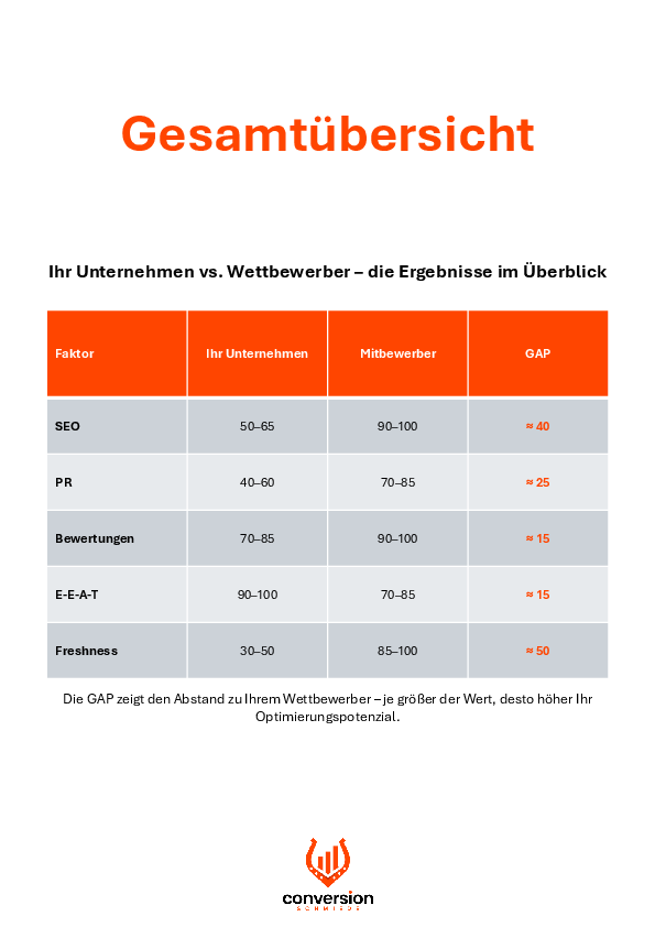 KI-Suchsysteme wie Google AI Overviews oder ChatGPT zeigen nicht alle Anbieter an – sondern nur wenige. Mit der GEO-GAP-Analyse erfahren Sie, wie Ihr Unternehmen in den fünf entscheidenden Faktoren wahrgenommen wird: SEO-Sichtbarkeit, PR, Bewertungen, E-E-A-T und Aktualität.