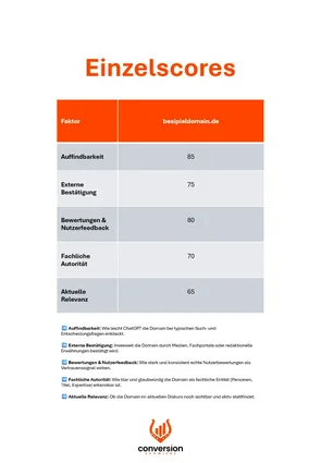 Nach dem Ausfüllen des Formulars erhalten Sie einen kompakten PDF-Report mit Gesamt- und Einzelscores, der zeigt, wie KI-Suchsysteme Ihr Unternehmen einordnen und welche Faktoren diese Wahrnehmung beeinflussen – hier sehen Sie einen Auszug aus dem Dokument: